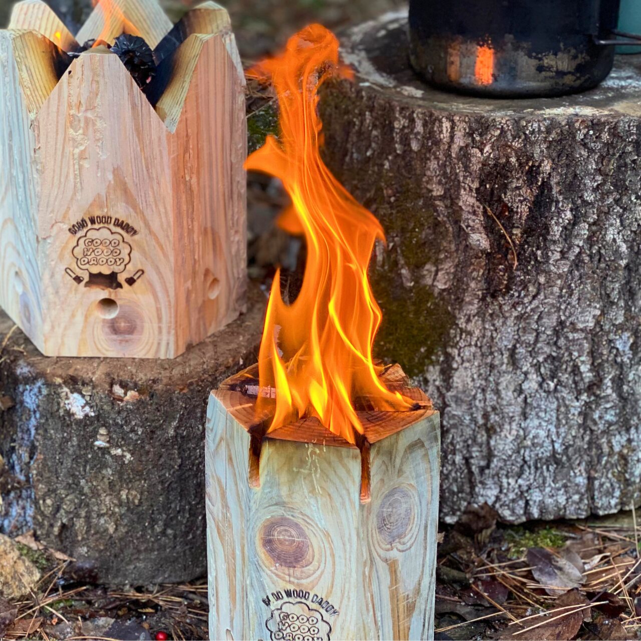 Good Wood Daddyのスウェーデントーチ「グリーンストーブ」は、他同サイズトーチの1.5倍燃焼。火力調整機能付きで、キャンプの焚き火から停電時の暖房まで幅広く活躍します。